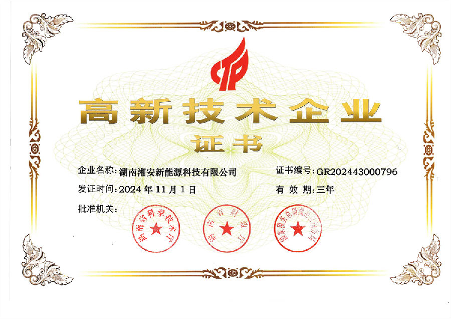 近日,湘安新能源收到湖南省科学技术厅、湖南省财政厅、国家税务总局湖南省税务局联合颁发的国家高新技术企业证书及奖牌(证书编号:GR202443000796),顺利通过国家高新技术企业重新认定,技术研发实力再获“国字号”认可。